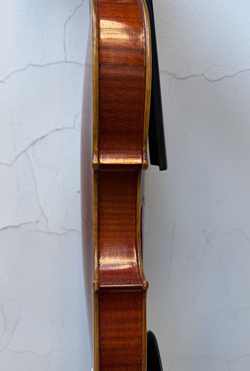 描述:該琴顏色較淺,面板的油漆是采用的仿舊工藝。透過淺色的油漆我們可以清楚的看到木材的紋路,材料上我就不多說,因為大家都可以清楚的看到。音質方面,就是一把特征明顯的歐料琴,聲音委婉而甜美,共振也相當不錯。